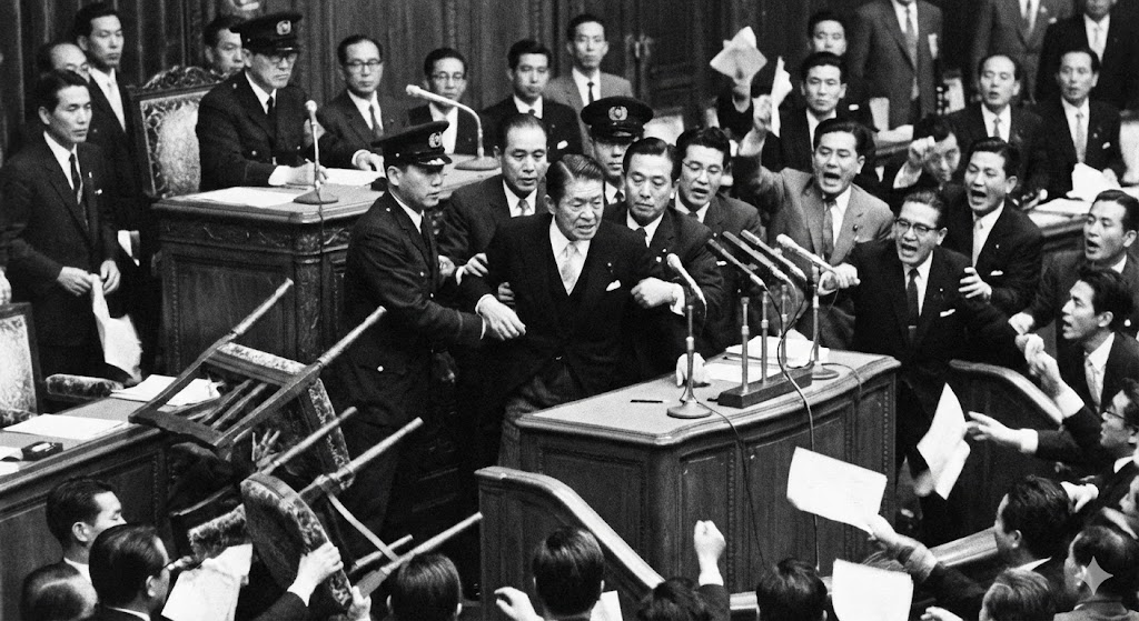 アイゼンハワー米大統領の来日が迫る中、岸首相は「5月19日」に行動を起こします。彼が狙ったのは憲法の自然成立規定でした。衆議院を通せば、30日後には自動的に条約が承認されるのです。これを阻止しようと、社会党議員は国会議事堂内で座り込みを行い、物理的なバリケードを築いて抵抗しました。議事堂は怒号に包まれます。