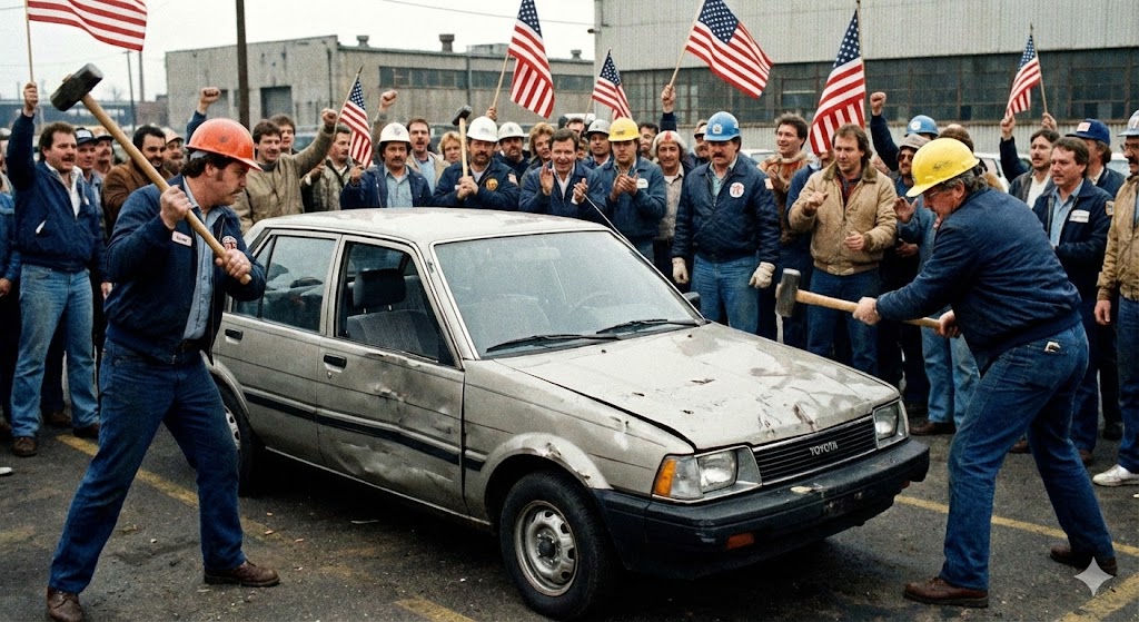 貿易赤字という数字上の経済問題以上に、当時の米国社会では日本を明確な「敵」とみなす感情論が渦巻いていました。ハンマーで日本車を叩き壊すなどの過激なパフォーマンスや排斥活動は、単なる経済摩擦の枠を大きく超え、人種的な偏見も絡んだ非常に危険なレベルに達していたのです。